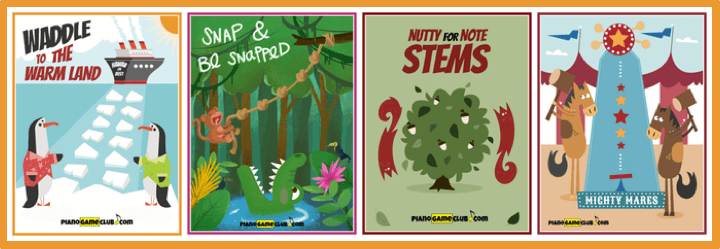 If you are not already a member of PianoGameClub and think that receiving new piano games every month like Mighty Mares, Snap and Be Snapped, Waddle To The Warm Land and Nutty For Note Stems sounds exciting, then click on the image below to see sample pages from May’s set.