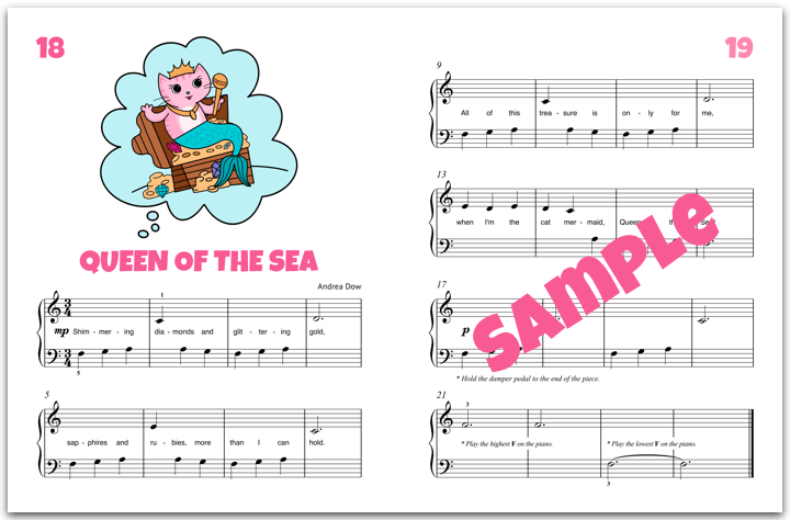 The Cat, the Mermaid, and the Soaking Wet Songbook contains eight pieces for mid-primer piano students (seven solos and a celebratory, end-of-book teacher/student duet).