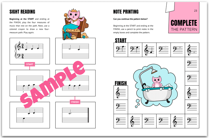 Inside you will discover cute songs with wonderful lyrics, note reading, sight reading and rhythm games, a practice tracker, and a certificate of achievement.