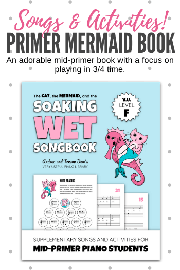 If you have a primer piano student who is in love with mermaids, unicorns, and all things magical you will definitely want to hop on over to Amazon right now and pick up The Cat, the Mermaid, and the Soaking Wet Songbook.