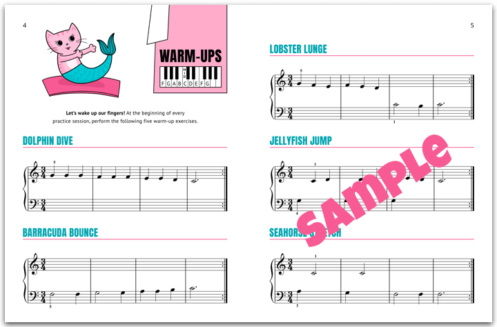 The Cat, the Mermaid, and the Soaking Wet Songbook begins with two pages of getting ready, warm-up exercises that students should perform at the beginning of every practice session to boost note-reading skills, coordination, and finger strength.