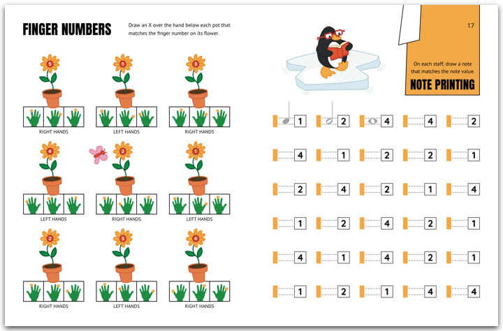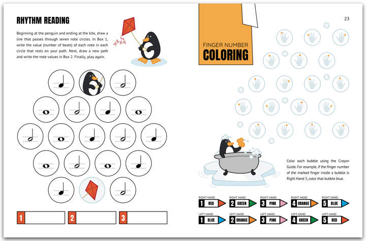 Interspersed throughout the book are activity pages to supplement the music. These activity pages include finger strength exercises, rhythm reading games, note printing exercises, and a coloring activity. Here are a few samples of these pages: