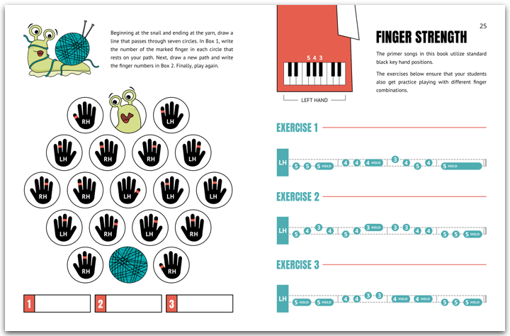 Interspersed throughout the book are activity pages to supplement the music. These activity pages include finger number games and activities and finger strengthening exercises. Here are a few samples of these pages: