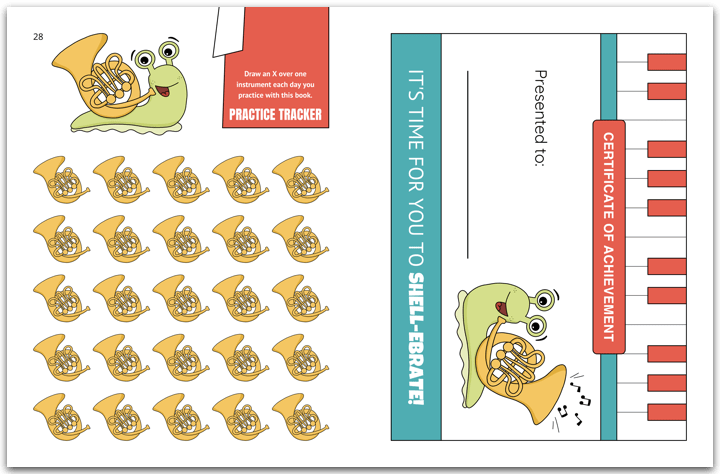 Kids practice more often when they take ownership of their learning. At the end of Glissando and the Slimy Songbook, students will find a practice tracker page where they can keep track of their hard work in a kid-friendly way. Furthermore, upon completion of Glissando and the Slimy Songbook, students receive a Certificate of Achievement to reward their efforts. Simply cut out the certificate, fill in the relevant details, and present it to the deserving student.