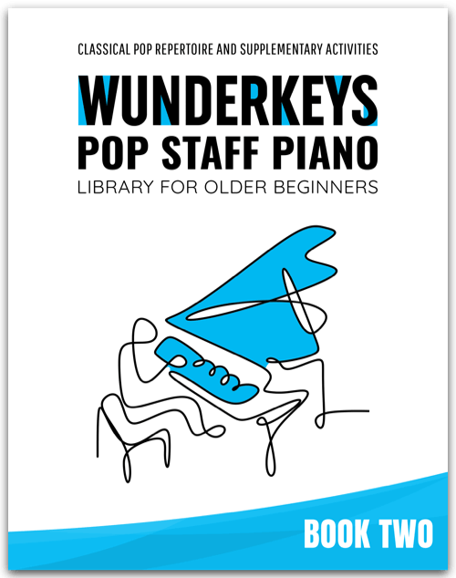 WunderKeys Pop Staff Piano Library For Older Beginners is fun, clean, clear, and concise. Adults aren’t overloaded with pages of useless text or ghastly-looking diagrams. We get right to the music…
