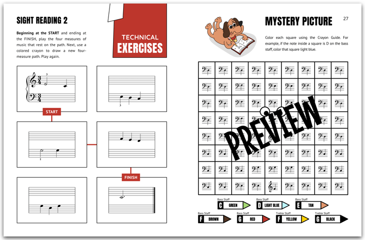 Interspersed throughout the book are activity pages to supplement the music. These activity pages include sight reading exercises, note reading games, rhythm work, note printing activities, and a Color-It Note Reading Mystery Picture. Here are a few samples of these pages: