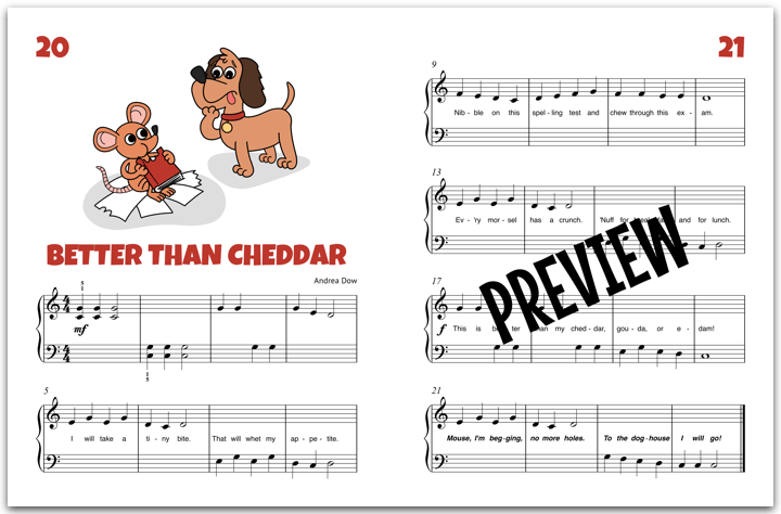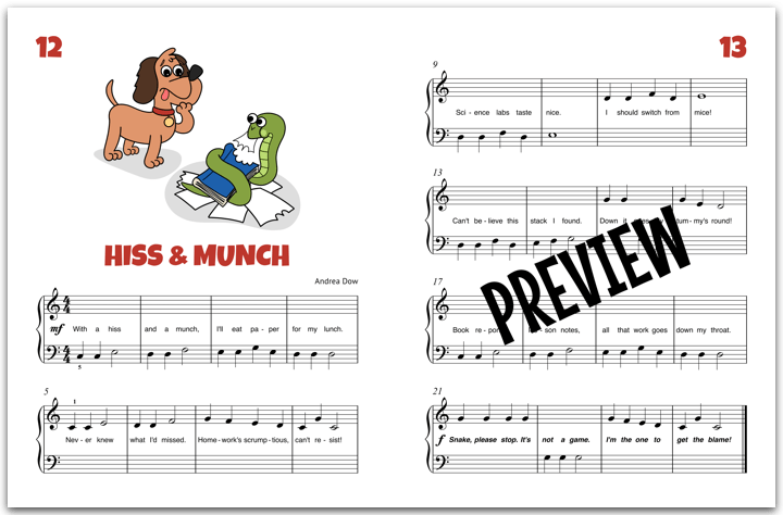 In another “unique-to-WunderKeys” approach, we’ve designed this book so that engaging piano songs follow along with a hilarious children’s story. View sample pages below:
