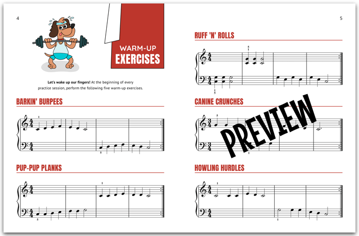 Who Slobbered On My Songbook? begins with two pages of getting ready, warm-up exercises that students should perform at the beginning of every practice session to boost note-reading skills, coordination, and finger strength.