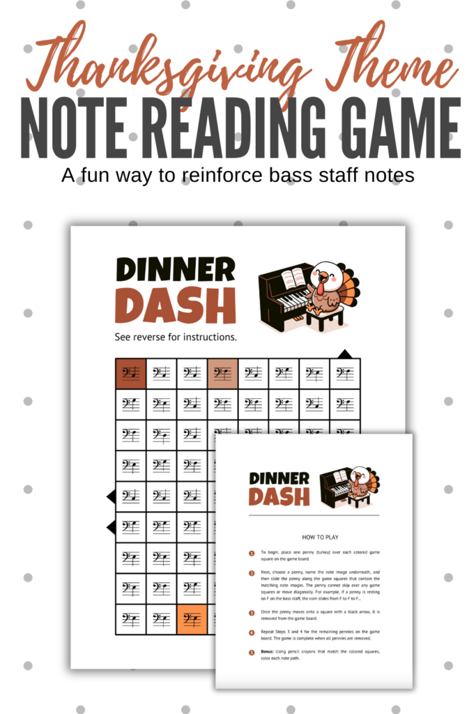 Dinner Dash (found at the very end of this post) is a turkey-themed game that reinforces bass staff reading in the C 5-finger scale.
