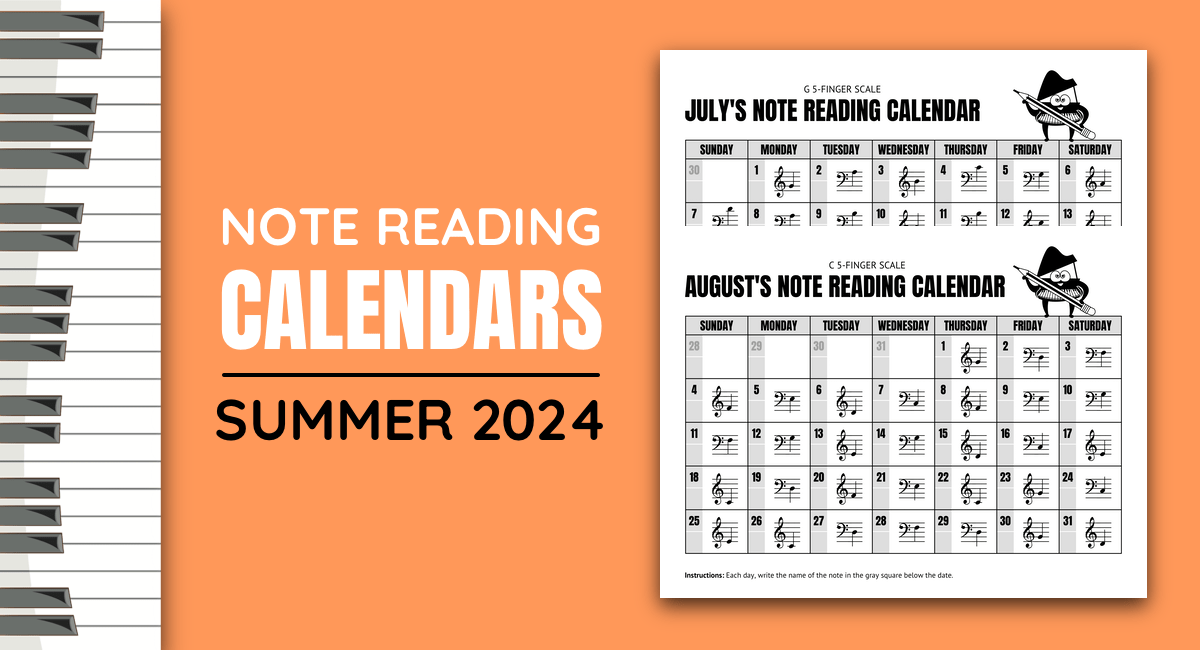 Click here or on the image below to download our 2024 Summer Note Reading Calendars from the Teach Piano Today Homework Pages.