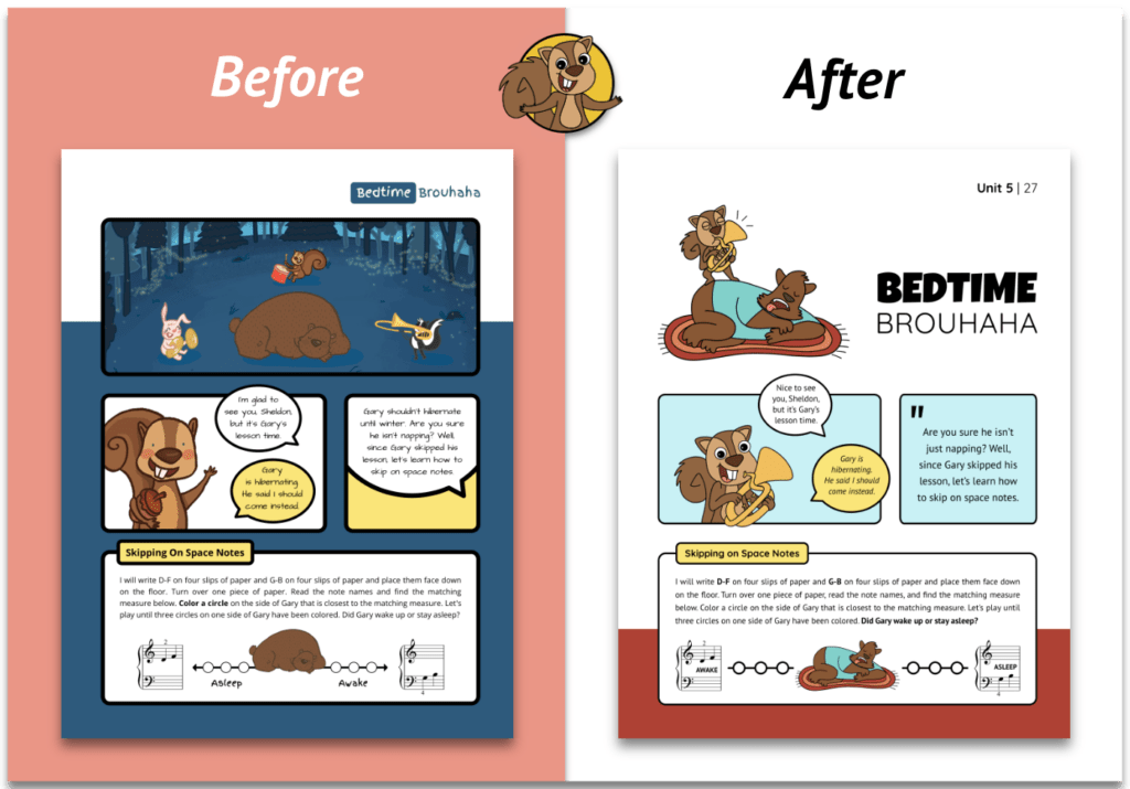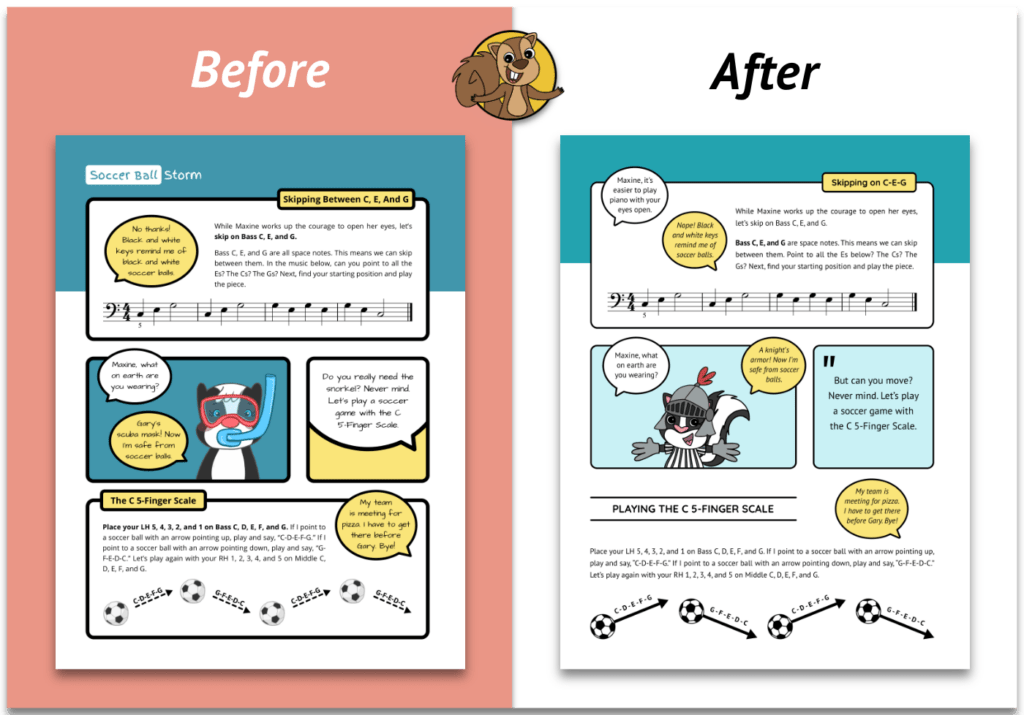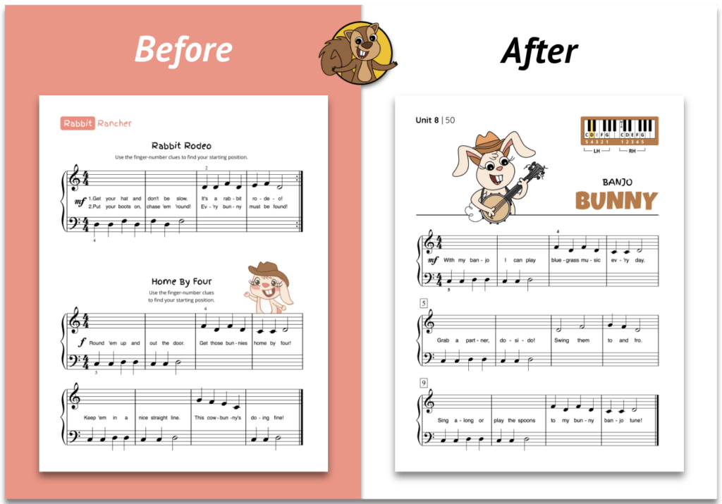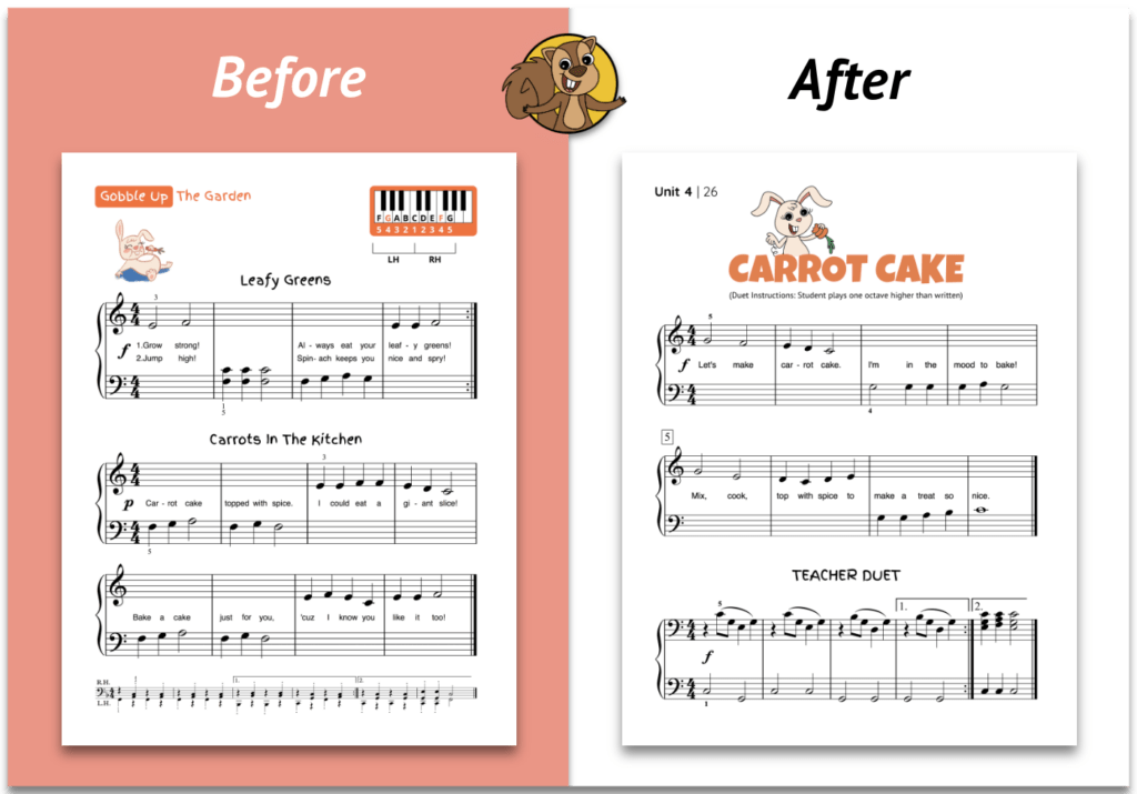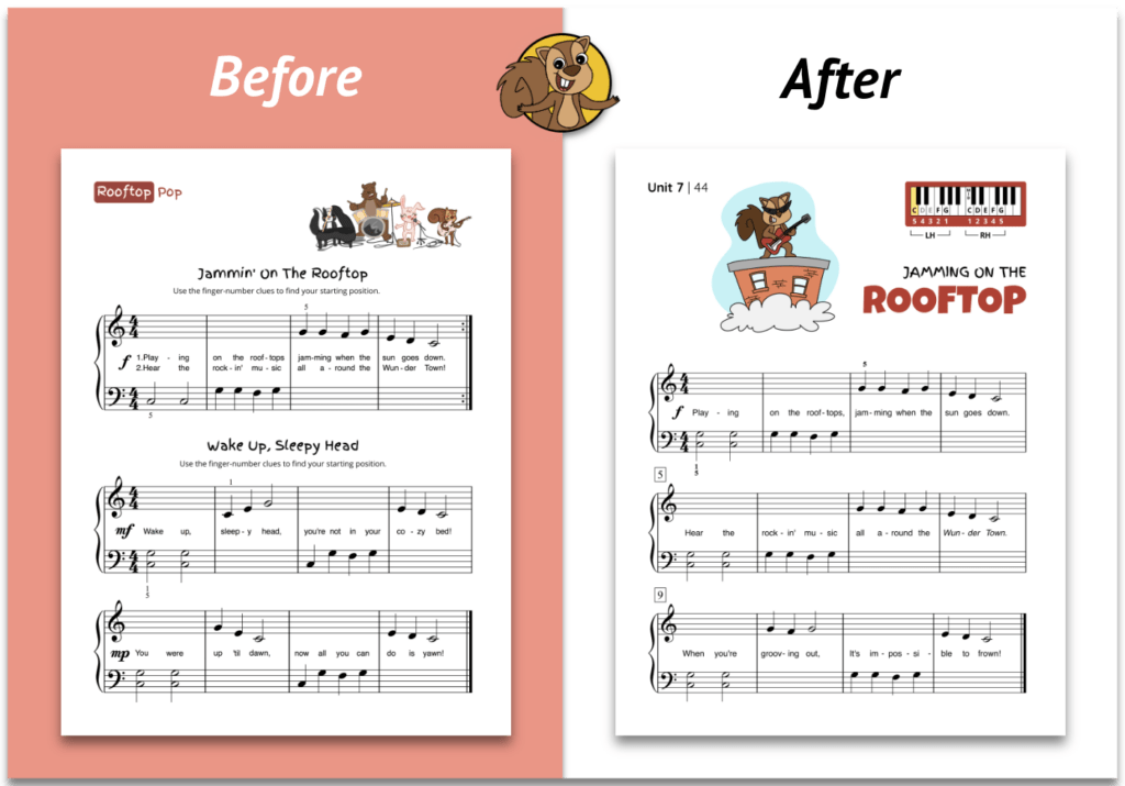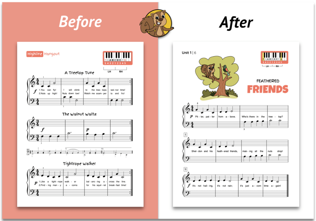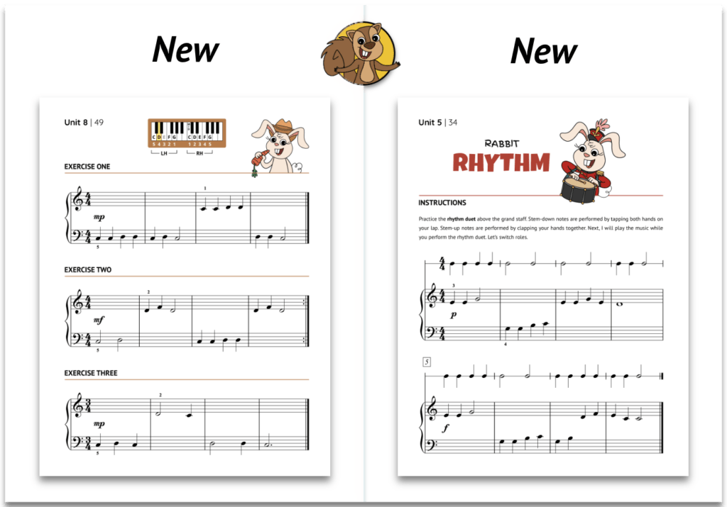 We’ve taken everything you loved about the original Primer Piano Book Two and made it even better. From enhanced visuals to expanded content, the side-by-side comparisons below showcase the updates that will inspire your students and simplify your teaching.