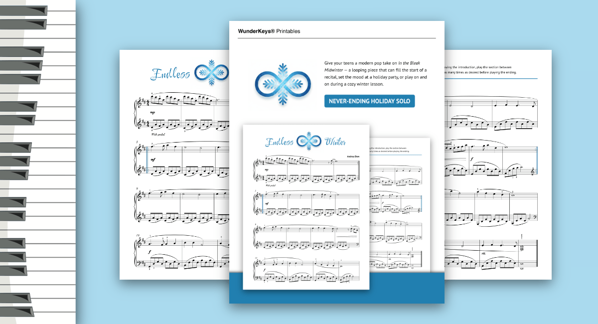 Meet Endless Winter — a modern, wintry pop take on In the Bleak Midwinter that your teens can loop for as long as their hearts (and fingers!) are happy. With a repeating center section designed for limitless play, this piece can drift gently through the start of a recital, wrap a holiday party in atmosphere, or turn an ordinary lesson into a winter-day soundtrack that never has to end.