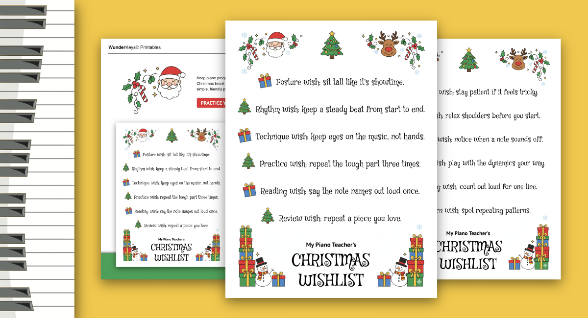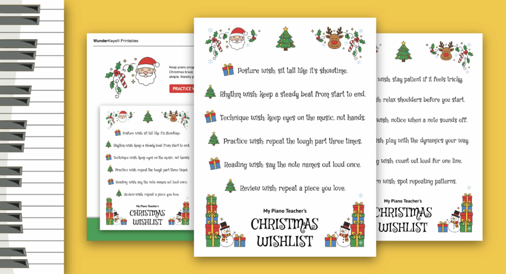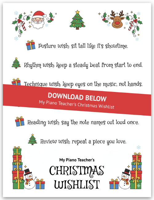 That’s why we created My Piano Teacher’s Christmas Wishlist, a two-page Christmas piano practice printable that becomes a friendly stand-in while you’re away. It’s basically a tiny take-home piano teacher wrapped in festive cheer.