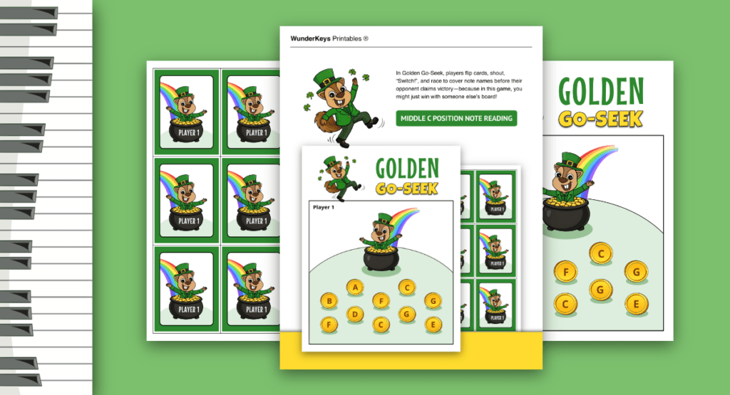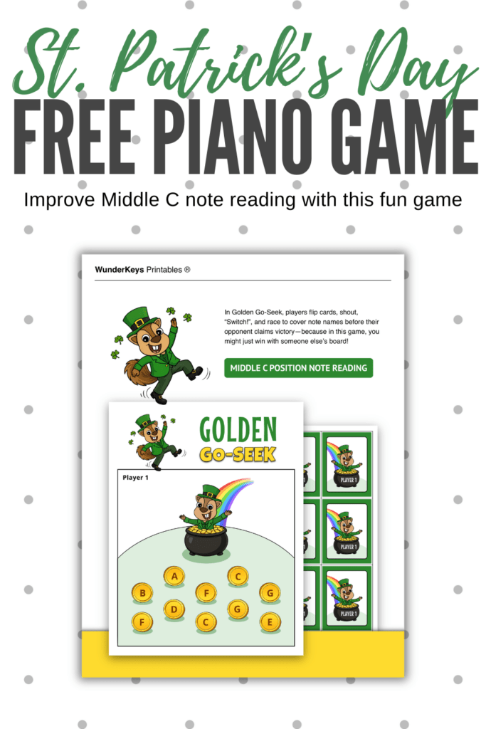 Today’s printable is a St. Patrick’s note reading game that reinforces Middle C skills and makes you look very on top of things.