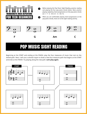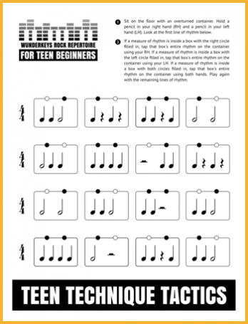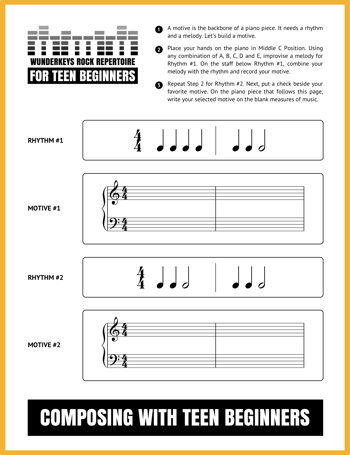 With WunderKeys Rock Repertoire we are revolutionizing piano music for teen beginners. You will not find Twinkle, Twinkle, Little Star, My Bonnie Lies Over The Ocean, or Mary Had A Little Lamb in this book. Instead, you will find rock-infused music written just for teens in their first year of piano lessons.